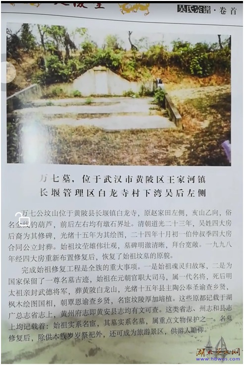 我始祖萬七公, 系泰伯、仲雍第八十五世孫。原籍江西撫州府臨川縣瓦硝墩人,公文韜武略,策名大司馬。元朝末年(約1360年)遷入楚地為官(黃州府守備),因軍功卓著,明太祖朱元璋勅封武德將軍,逝后又誥封龍虎將軍,賜葬黃陂白龍山,建祠奉祀(今武漢黃陂區(qū)王家河鎮(zhèn)白龍寺原屬萬七公家廟),歷時巳600余年,墓地在道光癸卯年(1843年)重修,至今又近180年,因風雨侵蝕,年久失修,雖碑存文在,卻模糊不清,淹沒在荒涼野草之中,其狀令人傷懷,后輩情何以堪。故此,修繕始祖萬七公墓是每一位吳氏萬七公后裔的責任與擔當。