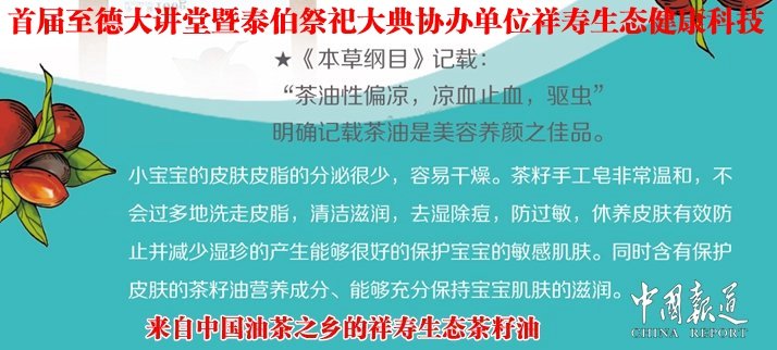 特別感謝南平市祥壽生態(tài)健康科技有限公司董事長吳祥明為2019年新時(shí)代首屆至德大講堂暨泰伯祭祀大典贊助價(jià)值12800元健康生態(tài)茶籽油、茶籽粉、茶籽面膜、茶籽手工皂系列產(chǎn)品。