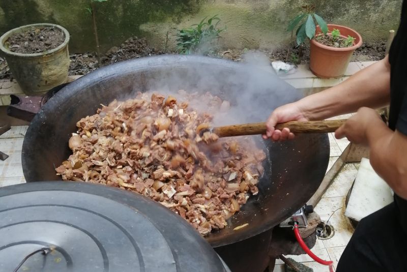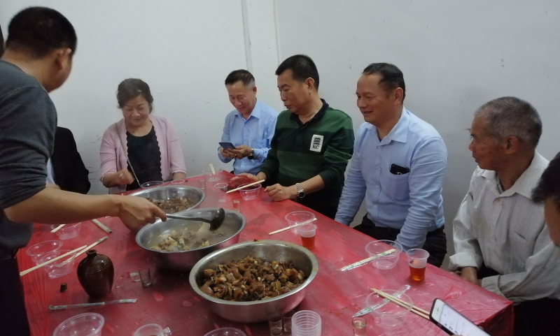這一次,平山圍的宗親為迎接從遠(yuǎn)近各處而來的吳氏宗親,專門宰殺了一頭牛,來宴請(qǐng)大家,受邀請(qǐng)而來的吳氏宗親,不僅有本村的念四公的后裔,也有外遷的念四公的后裔,而且還有念一公的后裔,當(dāng)然還包括深吳會(huì)的來自兩陸、番禺、增城、黑龍江、安徽等地的宗長(zhǎng)、宗嫂、宗親。正如深吳會(huì)會(huì)長(zhǎng)吳長(zhǎng)陽宗長(zhǎng)所說的,一宗無二姓,吳氏一家親,吳氏宗親不分哪支哪派,三千年前都是一家,只是后來分散開來居住而己,無論住在哪里,無論來自哪個(gè)支系,都是一家人。