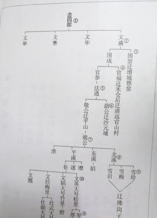 據(jù)資料介紹,吳宣公的長(zhǎng)子是綸公,綸公的次子是宥公(承順公),宥公的次子是坤二公,坤二公的三子是吉甫公,吉甫公的長(zhǎng)子是五四郎公,五四郎公九子是千九郎公,千九郎公長(zhǎng)子六四郎公,六四郎公的四子即是本村的先祖念四公。從五四郎公開始,即從福建永定遷到廣東大埔。