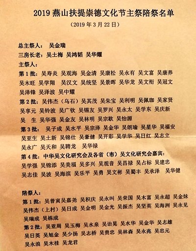 2019燕山扶提祟德文化節(jié)主祭陪參名單:總主祭:吳金瑞,三房長者:吳土梅吳鴻銷吳華耀主系人:第1批 吳壽炎、吳觀海、吳金清、吳康松、吳水有、吳文富、吳康養(yǎng)、吳木旺、吳學(xué)翔、吳漢文、吳統(tǒng)堅、吳最暉、吳華龍、吳文街、吳冠文。第2批 吳偉杰(烏石)、吳其茂、吳朱寶、吳利明、吳佩加、吳家鎮(zhèn)、吳享元、吳鈴波、吳廣軟、吳錫友、吳羅興、吳水太、吳學(xué)東、吳慶新、吳生、吳華強、吳金友、吳林明、吳宗敏、吳伯源。第3批 吳子成、吳水平、吳宗洋、吳金華、吳明瑞、吳量華、吳福安、吳亞生、吳土新、吳錦住、吳豪健、吳開彩、吳學(xué)華、吳日紅、吳忠立、吳水廣、吳天和、吳聘龍、吳華祿。第4批 中華吳文化研究會及各省(市)吳文化研究會特邀嘉賓;吳學(xué)強、吳錦添、吳美福、吳多興、吳觀音、吳昌祿、吳志標(biāo)、吳占標(biāo)、吳建忠、吳志佳、吳波、吳海濱、吳樂平、吳勇、吳文彬、吳承洋、吳華健、《至德傳媒網(wǎng)》 《天下吳氏網(wǎng)》總編輯吳蜀豐等。