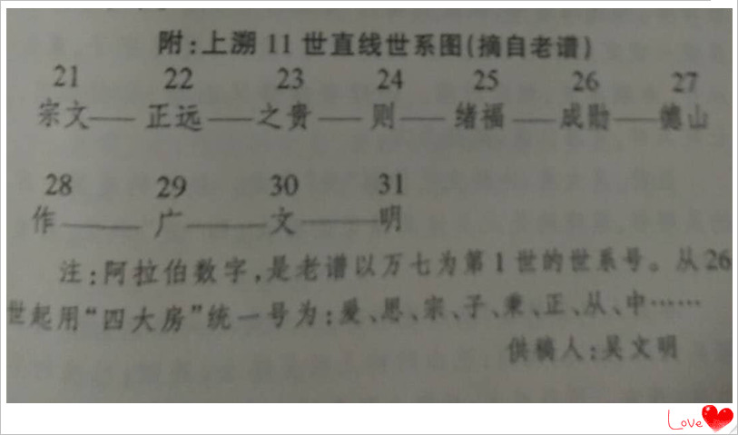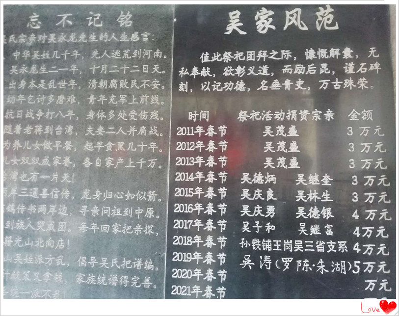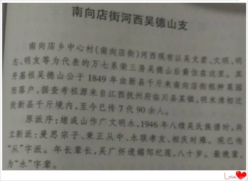 據(jù)吳玉鑫介紹,曾祖父吳德歷(立)、曾叔祖父吳德山,早在100多年前,他們生活居住在光山(羅山)和千斤一帶(現(xiàn)羅山和新縣千斤邊界的部分鄉(xiāng)鎮(zhèn),在清末和民國時期,都屬光山轄區(qū))。當(dāng)年由于生活所迫,祖太奶吳田氏攜六子(紹文、紹?紹華、紹昌、紹忝、紹周),以及我曾叔祖父吳德山一家逃荒(討飯)來到江蘇省溧陽縣上沛埠油榨頭落腳,其后裔至今都在此地一帶生活?,F(xiàn)居住在江蘇省溧陽市上興鎮(zhèn)的本支吳氏族人,繁衍至目前巳第六代,現(xiàn)有男女丁百余人。然而,曾祖父吳德歷(立)當(dāng)年留守在光山老家,直至生歿葬均失考。光陰似箭,昔日先輩們下江南的年份未知,以及相關(guān)信息早已淹沒在茫茫歷史長河中,僅靠長輩口頭上的有限資訊。