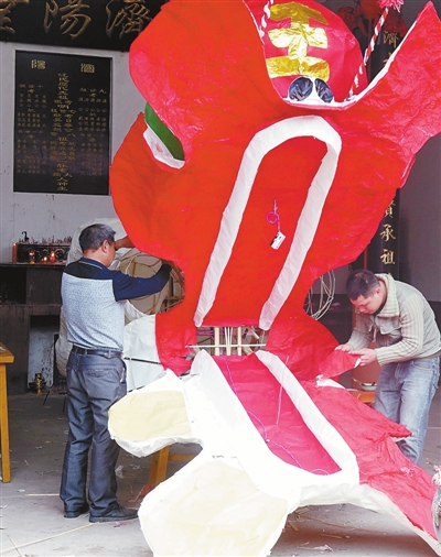 據(jù)江師傅介紹,今年中堡大龍有68節(jié),約300米長,正月初四、初五,他們就備好龍板、竹篾筋骨、宣紙等,以后一直忙著制作。“最重要的是龍頭,3米多高、7米長,龍口內(nèi)含大紅龍珠,龍身則是家家戶戶自行制作。”江師傅說,還要備好龍棍、插袋布等,最終制成“姑田大龍”。前后整個制作過程約需10天。