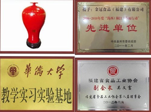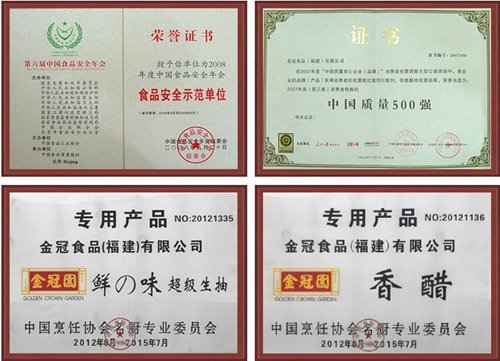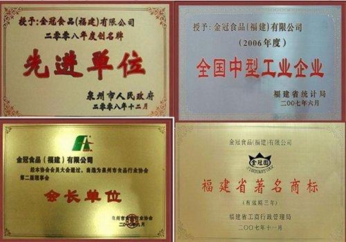 歷年來,企業(yè)通過S09001國際質量管理系認證, HACCP食品安全管理體系認證,1S014001環(huán)境管理體系認證,CIQ出口衛(wèi)生注冊美國FDA認證和QS認證,嚴格品質管理,注重品牌建設,“金冠園牌先后榮獲“中國馳名商標”、“中國星火計劃項目”、“全國食品工業(yè)龍頭食品企業(yè)”、“福建省星火行業(yè)技術新中心”、“食品衛(wèi)生A級單位”,“質量穩(wěn)定產品”、“質量第一,誠信經營企業(yè)”、“市先進單位”、“守合同、重信用企業(yè)”、“品牌泉州公眾印象獎”等榮譽稱號。產品暢銷全國各地并大量出口,深受廣大消費者青睞。