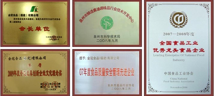金冠食品在董事長吳文富的創(chuàng)辦下,以創(chuàng)新、創(chuàng)優(yōu)、創(chuàng)名牌為理念,以質量求生存、以信譽求發(fā)展為企業(yè)宗旨、“金冠園”牌醬油調味品“金冠” 牌糖果系列產品多年來被國家評定為 “中國馳名商標”、“中國名牌產品”、“國家免檢產品”、福建省行業(yè)技術中心、省級“先進企業(yè)”、“國家質量達標食品”、“質量第一,誠信經營企業(yè)”、福建省調味品(醬油、醋)生產標桿企業(yè),“泉州市集群龍頭企業(yè)“等,獲得泉州市、晉江市科技二等獎。