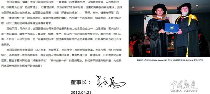 中國報道訊(吳蜀豐)金冠園食品(福建)有限公司,系外商獨資企業(yè),是一家以醬油、醋生產為龍頭集研發(fā)、生產、銷售、出口為一體的調味品大型企業(yè)。
