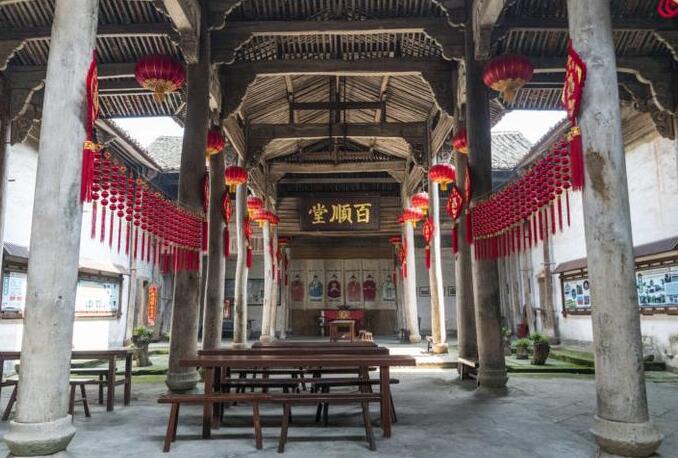 戴氏宗祠又稱“百順堂”,位于婺城區(qū)湯溪鎮(zhèn)寺平古村,始創(chuàng)于明代,是始祖戴宗碧“賢”字輩一代建造的。建筑坐東北朝西南,磚木結(jié)構(gòu),硬山頂。磚雕“戴氏宗祠”四字,大氣莊重。大門構(gòu)筑在青石砌高臺上,面寬三間,內(nèi)設(shè)門廳、正廳和后廳,安置戲臺,形成“工”字形平面??傉嫉孛娣e近萬平方米。