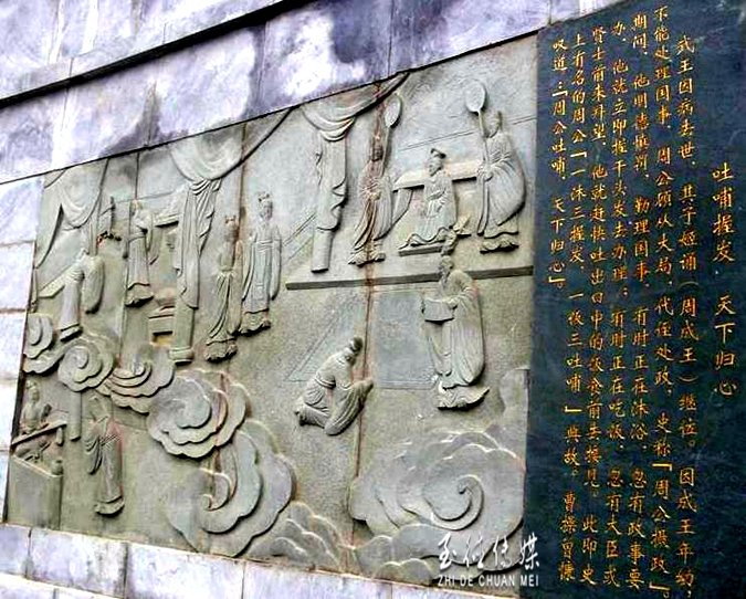 為了國(guó)家興旺,他明德慎罰,勤理國(guó)事,周公非常重視人才的接納和任用。凡是有賢士前來(lái)拜訪,他總是在第一時(shí)間去接見(jiàn)。一次在吃飯的時(shí)候,他聽(tīng)說(shuō)有人來(lái)拜訪,好幾次將吃在觜里飯吐出來(lái),立即去接見(jiàn)來(lái)人。還有在沐浴的時(shí)候,有才能的人先后來(lái)拜訪和急事要辦,他好幾次停止沐浴,終止洗頭,握著頭發(fā)前去接待來(lái)人,生怕怠慢來(lái)人,錯(cuò)失人才,耽擱事務(wù),即使這樣,周公還擔(dān)心失去天下賢人的輔助,這就是歷史上有名的“一沐三握發(fā),一飯三吐哺”典故。三國(guó)時(shí)期著名政治家、文學(xué)家曹操在《短歌行》中對(duì)周公非常仰慕和贊美,慷慨道:“周公吐哺,天下歸心”。 周公“一沐三握發(fā),一飯三吐哺”,禮賢下士,重用人才,為周王朝蠃得了許多治國(guó)理政的賢才,使周王朝政權(quán)穩(wěn)固,繁榮昌盛。