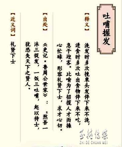 “吐哺握發(fā)”的典故與我們今天以人為本,任人為賢,勤政廉潔的用人觀是一致的,因此,我們?cè)趫?jiān)持正確用人觀的同時(shí),要樹(shù)立強(qiáng)烈的用人意識(shí)和勤政觀念。