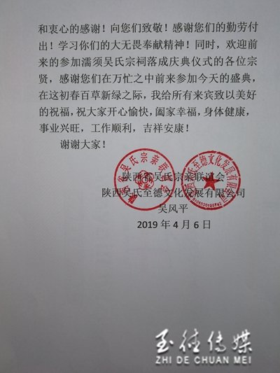 理事長吳永華在發(fā)言中說,在吳氏祠堂落成值此清明之際,吳氏宗親齊聚堂,追思先人,聯(lián)誼族人的親情友情,在此我代表吳氏宗親理和衷心的對(duì)參加祭祖的親人們,表示熱烈的歡迎!飲水定當(dāng)思源,不忘尋根問祖表明自己與祖先血脈相連。彥公之湍,歷六白余年,枝繁時(shí)茂,行傳中五世而今后將遍布四方??梢哉f是多少代,多少人,才實(shí)現(xiàn)了今天駐足祖先之地,故士鄉(xiāng)音,聲聲親切!這就是源于血脈相通同根共祖脈承,手足情深 血濃予水。如果說家是一個(gè)人的歸屬,那么族就是所有家的整合懷著顆虔敬至誠的心,來祭奠我們的先祖。各位宗親,根深不怕樹搖動(dòng),樹正何愁月影斜。促進(jìn)了我們這個(gè)大家族的交流和連結(jié)。我相信通過大家的努力家族必將更加和睦,更加團(tuán)結(jié),更加興旺發(fā)達(dá)!