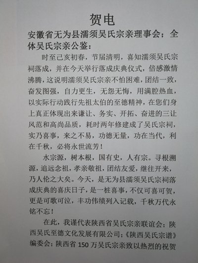 中國輕工企業(yè)投資發(fā)展協(xié)會,吳文化產(chǎn)業(yè)技術(shù)創(chuàng)新戰(zhàn)略聯(lián)盟,陜西省吳氏宗親聯(lián)誼會,陜西吳氏至德文化發(fā)展有限公司,貴州省吳氏宗親總會,至德傳媒訊(天下吳氏網(wǎng))重慶泰伯文化傳媒有限公司等單位發(fā)來賀電!