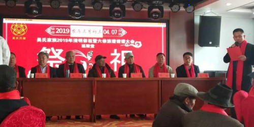 不忘先祖建功德,傳承至德美名揚(yáng),弘揚(yáng)吳氏文化,再創(chuàng)吳家輝煌。2019年4月7日,江蘇省宿遷市吳樓清明祭祖暨六修族譜慶典隆重召開。上臺(tái)發(fā)言的有九十歲的宗長(zhǎng)、長(zhǎng)年在外公干的吳建明,、當(dāng)?shù)卮逦瘯?huì)的書記吳沅鍇,六修族譜的主任吳輝向大家匯報(bào)修譜的工作報(bào)告,會(huì)議由吳昆的主持。參加的宗親還有徐州蘇北吳氏宗親理事會(huì)理事長(zhǎng)吳忠厚、宿遷市美人河酒業(yè)董事長(zhǎng)吳夢(mèng)城、邳州市代表吳亞洲、吳永、睢寧縣代表吳朝臣、吳永倉(cāng)、新沂市代表吳蘇州等。