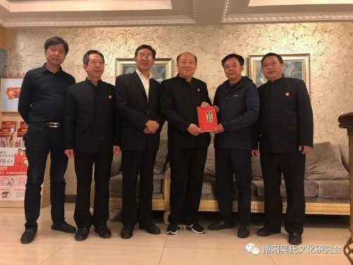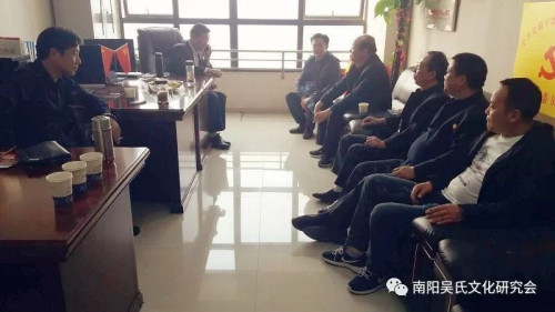 2019年4月7日下午,南陽吳氏文化研究會會長吳雷、副會長兼秘書長吳天恩、常務理事吳念召一行專程到訪安徽至德傳統(tǒng)文化研究院,并與當?shù)刈陂L進行座談交流。安徽至德傳統(tǒng)文化研究院執(zhí)行院長吳瑞賢,顧問吳子波、吳德良,辦公室副主任吳永文、吳文東,理事吳遠鋒,蕭縣吳氏文化研究會會長吳曙光等人熱情接待了吳雷一行。吳瑞賢執(zhí)行院長簡要介紹了安徽至德傳統(tǒng)文化研究院2014年5月掛牌成立以來所做的主要工作,如對至德文化的深入研究、安徽省吳氏族譜的編寫及對各市縣吳氏文化研究組織的廣泛聯(lián)系等。