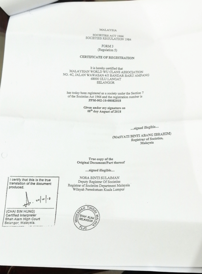 吳啟熊主席為此特地向莞吳宗親正式遞交了一封信函,信函中有馬來西亞社團(tuán)注冊局給世界吳氏宗親總會的登記文件的中文版與英文版。以此證明世界吳氏宗親總會是在合法政府經(jīng)過合法注冊的社會團(tuán)體。
