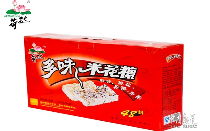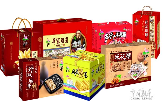 荷花米花糖:采用優(yōu)質(zhì)糯米深加工而成,配以極富營養(yǎng)價(jià)值的核桃、芝麻、花生、白砂糖和冰糖,以及獨(dú)特工藝自制的麥芽糖。產(chǎn)品潔白酥脆,香甜化渣,甜而不膩,可直接食用,也可泡牛奶或開水吃,米?;ㄒ娝粫?huì)變形成粥狀。老少皆宜,家居的甜品首選,旅游的黃金搭檔。后來荷花人順應(yīng)家鄉(xiāng)人喜食辣椒和花椒的習(xí)慣,開發(fā)了早茶味、麻辣味、椒鹽味米花糖,以饗巴渝食客,深受大眾喜愛。荷花珍珠芝麻片:特別選料,特別配方,特別工藝,特別制作,有突出的芝麻清香,酥脆爽口,色、香、味、形,彰顯出珍珠般的高貴品質(zhì)。荷花怪味胡豆:以其特有的傳統(tǒng)工藝,將麻、辣、甜、咸、鮮、酥、脆、香等多種滋味融為一體,堪稱巴渝地方傳統(tǒng)食品一絕。荷花蛋苕酥:是以鮮雞蛋和鮮紅薯為主材,輔以營養(yǎng)豐富的糯米、棕櫚油、麥芽糖和脫皮芝麻仁深加工而成的一款健康零食。因其色澤自然,口味原始,酥脆化渣,粗纖維含量豐富,每一塊重量適中,食用方便,是現(xiàn)代辦公零食和旅游攜帶的尚品。荷花芝麻桿:是純粹的麥芽糖為材料,純手工制作而成的。色澤微黃,中空外直,桿身均勻,外衣裹以脫皮白芝麻,味道醇正,嚼勁十足,營養(yǎng)均衡。荷花鳳凰蛋卷:手工制作,無添加劑,蛋香濃郁。