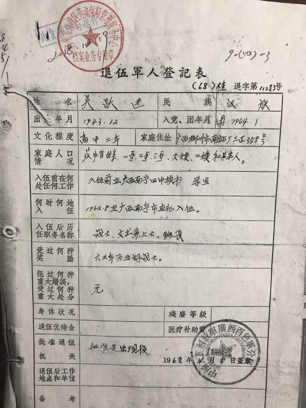 入伍后我們到百色市新兵連去集中訓(xùn)練,經(jīng)過三個(gè)月的新兵訓(xùn)練而后分配到連隊(duì)去工作。連隊(duì)的生活是艱苦的也是快樂的,每天6點(diǎn)鐘起床,全副武裝集體跑四公里回來才吃早餐。盡管訓(xùn)練很艱苦,但覺得生活很有意義,也很快樂,那時(shí)我才18歲不知道什么叫苦和累。上午是軍事訓(xùn)練,下午是政治學(xué)習(xí),夜里經(jīng)常進(jìn)行緊急集合到20公里外的山林里去撿蔣介石飛機(jī)空投下來的反動(dòng)傳單。這些緊張快樂的軍旅生活不知不覺地就過去了6年,而后依依不舍地退出現(xiàn)役回到地方參加工作。