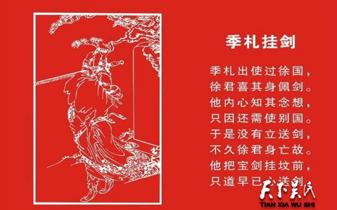 釋義 將寶劍掛在故友的墳上。比喻朋友間重友誼,重承諾。心有所許,終不相負(fù)。余祭派季札出使中原,了解中原各國(guó)的現(xiàn)狀,擴(kuò)大吳國(guó)的影響。季札路經(jīng)徐國(guó),看到徐國(guó)人民安居樂(lè)業(yè),五谷豐登,于是就去拜訪徐國(guó)國(guó)君,互道仰慕之情。徐君得知大賢人季札來(lái)訪十分開心,設(shè)宴盛情款待。酒宴上徐君看到季札佩帶的一把賣相很好的寶劍,很是喜歡,但始終沒敢開口表態(tài)。但季札看在眼里,明白在心里,雖想割愛,但是考慮到寶劍是使者身份的象征,也只有暗下決心,等出使的任務(wù)完成回徐國(guó)時(shí),再把寶劍送給徐君。誰(shuí)知世事變幻如白云蒼狗,等季札訪問(wèn)完五國(guó),再回到徐國(guó),打算履行心中的承諾時(shí),徐君卻在不久前暴病身亡。季札只得把寶劍轉(zhuǎn)贈(zèng)給繼位的徐國(guó)新君,但人家不接受,說(shuō):“先君沒有留下遺命,我不敢接受如此珍貴的禮物!”季札只好親自來(lái)到徐君墓前,懷著沉痛的心情,解下寶劍,鄭重地掛在墓前的樹上。一旁的隨從不能理解,問(wèn):“徐君都死了,掛把寶劍在這兒,他又看不到,您這么做有何意義呢?”季札回答說(shuō):“我離開徐國(guó)前就已經(jīng)在心里許下諾言,把這把劍贈(zèng)給徐君,現(xiàn)在又怎么能因?qū)Ψ缴砉识`背心中的承諾呢!”徐國(guó)人得知了季札“懸劍空壟”之舉,做歌頌揚(yáng):延陵季子兮不忘故,脫千金之劍兮帶丘墓。季札這種貴友情,輕財(cái)寶,重承諾,守誠(chéng)信的精神值得后人好好學(xué)習(xí)。