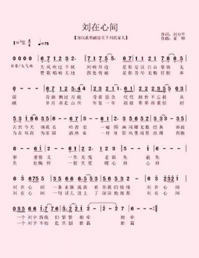 《劉在心間》歌詞的創(chuàng)作,由世界劉氏聯(lián)誼總會副主席劉萬平作詞,重慶流行音樂協(xié)會主席周亞輝作曲,采用真人樂隊、合唱團隊等精心打造,旋律優(yōu)美動人,歌詞大氣磅礴,聽后覺得震撼,充滿了力量,演唱起來更是有高昂、豪邁、奔放之士氣!從歌曲中可以聽出對劉姓祖先的吟頌,對劉氏族人的贊揚,熱情謳歌了劉氏族人有抱負(fù)、壯胸懷之氣概。正如歌詞:“一條血脈流淌著你我的情緣,一句話兒為你送上深深地祝愿……”無論你在哪里,一個“劉”字將我們緊緊相牽;無論什么時候,一個“劉”字不褪色,我們一起共創(chuàng)新篇。