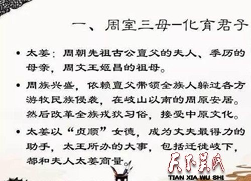 古公亶父先說(shuō)太姜吧。太姜,周朝先祖古公亶父的正妃,周文王的祖母。她以“貞順”的女德,成為丈夫得力的左膀右臂,是周朝創(chuàng)業(yè)之時(shí)的賢德婦人。在世共生有三子。她是周太王(即)的后妃,是一位非常賢德、頗有智慧的偉大女性,她的兒媳是太妊,孫媳是太姒。歷史上建立了豐功偉績(jī)的周武王和周公都是太姒所生。這三位母后懂得把女性最好、最高、最可敬的德行發(fā)揮到極致,是奠定周朝偉大基業(yè)、實(shí)施幕后工程的關(guān)鍵人物。太姜以身作則教導(dǎo)兒子,使他們從小到大,在品德行為上都沒(méi)有過(guò)失。她教導(dǎo)的長(zhǎng)子泰伯和次子仲雍為了尊奉父意,把王位讓給三弟季歷,以便再傳姬昌,便一起遠(yuǎn)奔江南吳地另辟新天地,促成了歷史上兄弟禮讓友愛(ài)的千秋佳話。這一切與母親太姜對(duì)兒子的良好教育大有關(guān)系。