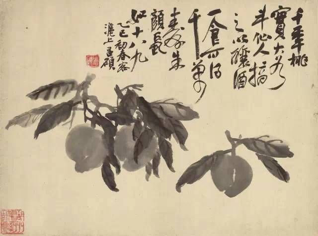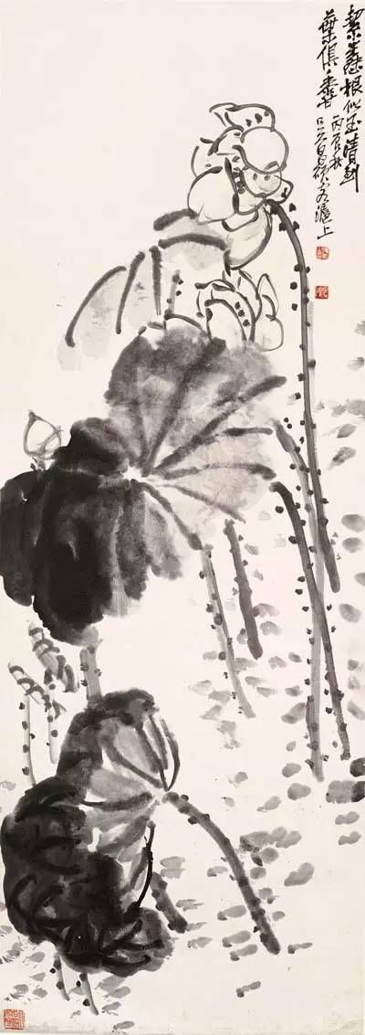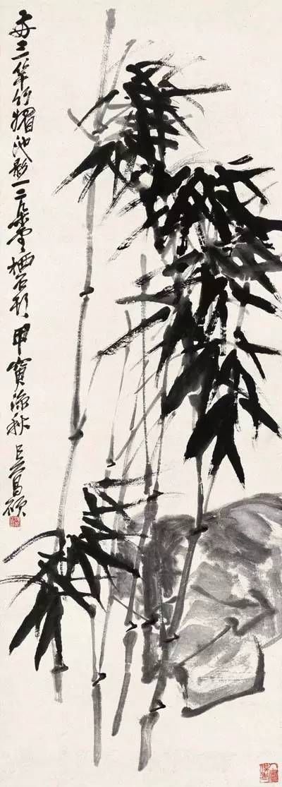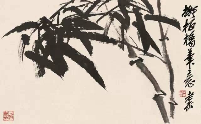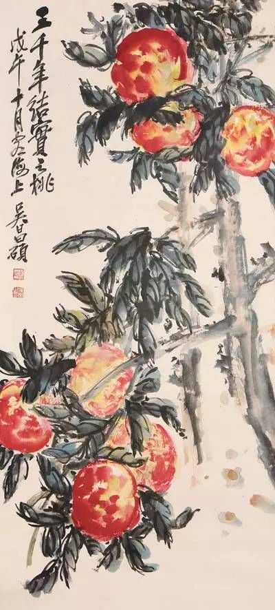 名重當(dāng)時(shí)的畫家任伯年對(duì)吳昌碩以石鼓文的篆法入畫拍案叫絕,并預(yù)言其必將成為畫壇的中流砥柱。吳昌碩作畫用“草篆書”以書法入畫;線條功力異常深厚。雖然從狀物繪形的角度看其線條的質(zhì)感似乎不夠豐富、切實(shí),但恰恰是舍棄了形的羈絆,吳昌碩的繪畫才步入了“意”的廳堂,從而形成了影響近現(xiàn)代中國畫壇的直抒胸襟,酣暢淋漓的“大寫意”表現(xiàn)形式。