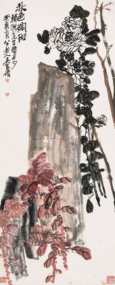 吳昌碩(1844.8.1—1927.11.29),原名俊,字昌碩,別號(hào)缶廬、苦鐵等,漢族,浙江湖州人。中國近、現(xiàn)代書畫藝術(shù)發(fā)展過渡時(shí)期的關(guān)鍵人物,“詩、書、畫、印”四絕的一代宗師,晚清民國時(shí)期著名國畫家、書法家、篆刻家,與任伯年、蒲華、虛谷齊名為“清末海派四大家”。吳昌碩的藝術(shù)別辟蹊徑、貴于創(chuàng)造,最擅長寫意花卉,他以書法入畫,把書法、篆刻的行筆、運(yùn)刀、章法融入繪畫,形成富有金石味的獨(dú)特畫風(fēng)。他以篆筆寫梅蘭,狂草作葡萄,所作花卉木石,筆力敦厚老辣、縱橫恣肆、氣勢(shì)雄強(qiáng),構(gòu)圖也近書印的章法布白,虛實(shí)相生、主體突出,畫面用色對(duì)比強(qiáng)烈。