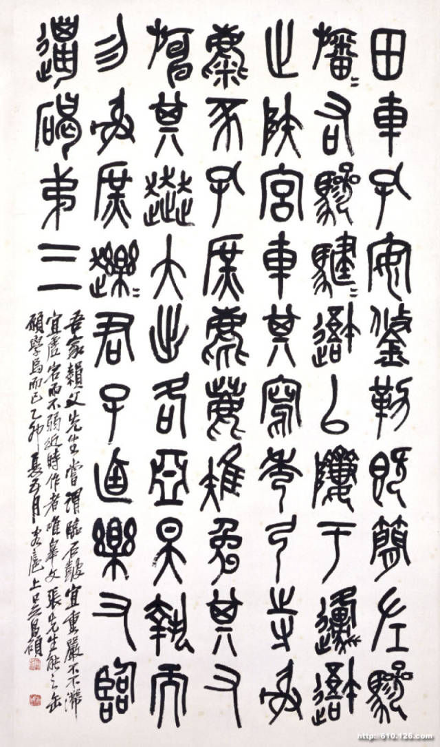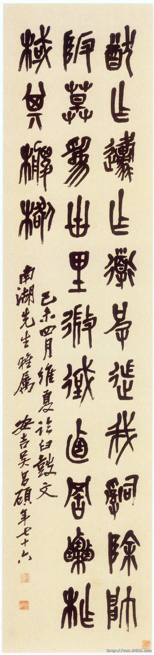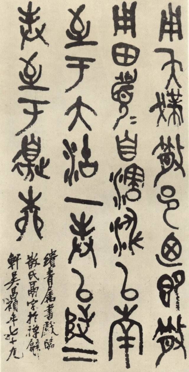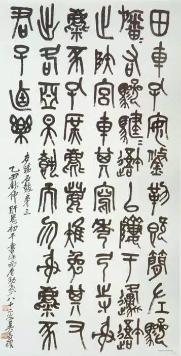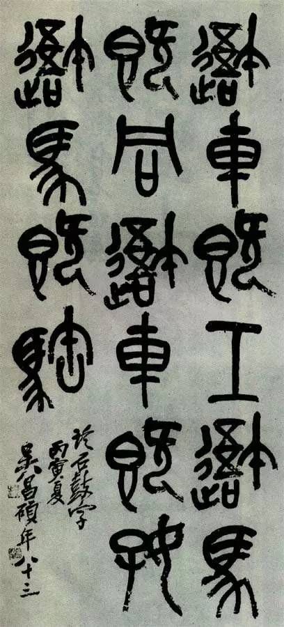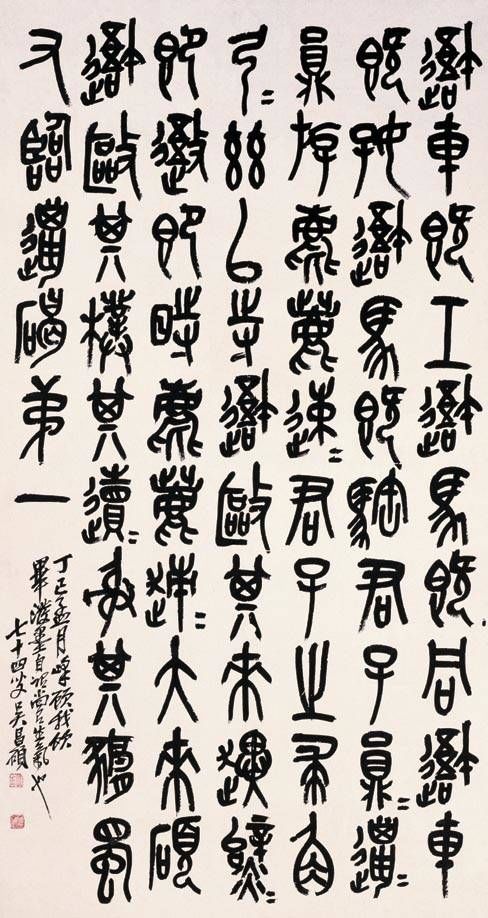 此軸筆法沉厚渾樸,筆力雄健,線條粗細(xì)富于變化,既師原文之意,得其形,又獨(dú)具風(fēng)骨。近人向燊評(píng)其書云:“昌碩以鄧法寫石鼓文,變橫為縱,自成一派。”此軸結(jié)字以上下左右參差取姿,用筆遒勁,氣息沉郁雄壯,自具新意。
