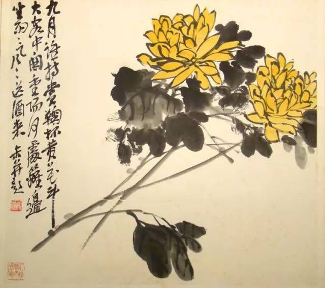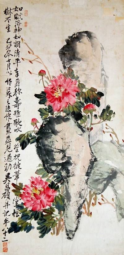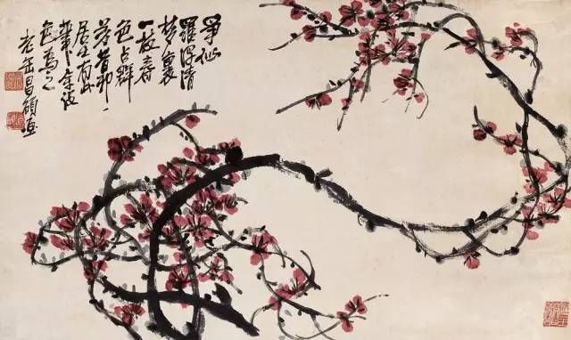 吳昌碩最擅長寫意花卉,受徐渭和八大山人影響最大,由于他書法、篆刻功底深厚,他把書法、篆刻的行筆、運(yùn)刀及章法、體勢(shì)融入繪畫,形成了富有金石味的獨(dú)特畫風(fēng),他自己說:“我平生得力之處在于能以作書之法作畫。”