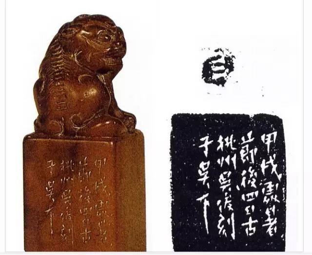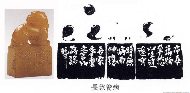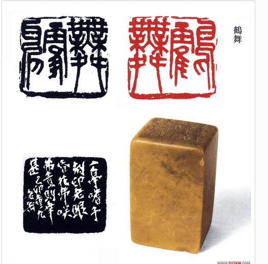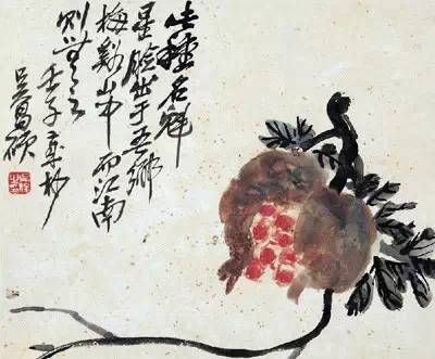 他的篆刻是從“浙派”入手,后專攻漢印,也受鄧石如、吳讓之、趙之謙等人的影響,成為一代宗師。他的畫起大落,善于留白,或?qū)庆バ?,氣象崢嶸,構(gòu)圖塊面體積感極強(qiáng)。他的篆書個(gè)性極強(qiáng),印中的字饒有筆意,刀融于筆。所以他的篆刻常常表現(xiàn)出雄而媚、拙而樸、丑而美、古而今、變而正的特點(diǎn)。篆刻方面吳昌碩上取鼎彝,下挹秦漢,創(chuàng)造性地以“出鋒鈍角”的刻刀,將錢松、吳攘之切、沖兩種刀法相結(jié)合治印。所以他的篆刻作品,能在秀麗處顯蒼勁,流暢處見厚樸,往往在不經(jīng)意中見功力。