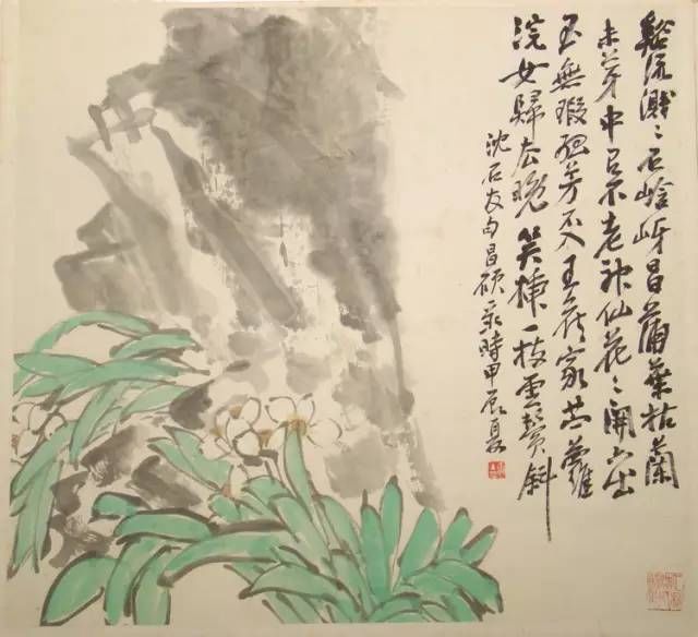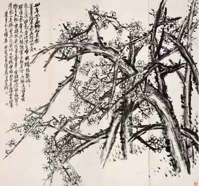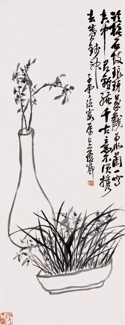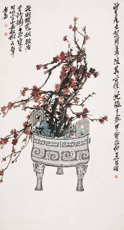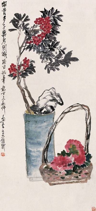 他常常用篆筆寫梅蘭,狂草作葡萄。所作花卉木石,筆力老辣,力透紙背,縱橫恣肆,氣勢(shì)雄強(qiáng),布局新穎,構(gòu)圖也近書印的章法布白,喜取“之”字和“女”的格局,或作對(duì)角斜勢(shì),虛實(shí)相生,主體突出。用色上似趙之謙,喜用濃麗對(duì)比的顏色,尤善用西洋紅,色澤強(qiáng)烈鮮艷。