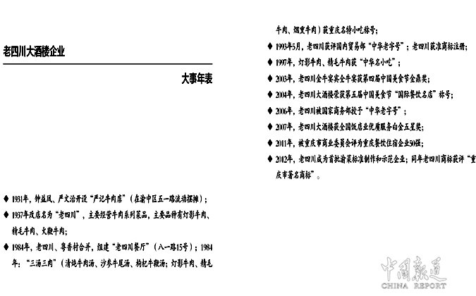據(jù)“老四川”金島花園耍壩店負(fù)責(zé)人岳郎介紹,老四川大酒樓創(chuàng)辦于20世紀(jì)30年代初,目前是重慶市僅有的兩家由國家命名為“中華老字號”的餐飲企業(yè)之一。