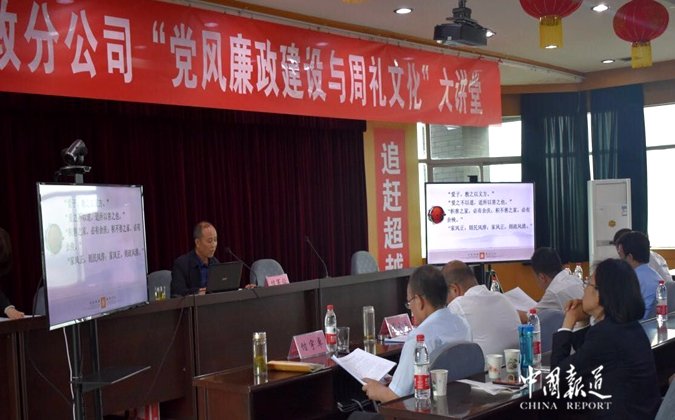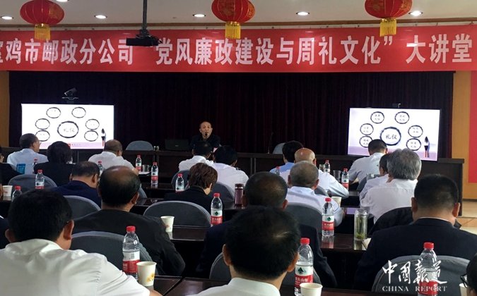 中國報道訊(特約通訊員 謝艷)為了貫徹習(xí)近平總書記“不忘初心,牢記使命”的囑托,使寶雞市郵政工作在高效廉潔上不斷創(chuàng)新,不斷進(jìn)步,邁上新臺階,2019年5月29日上午,寶雞市郵政分公司在周禮之鄉(xiāng)、古周原之地的寶雞市岐山郵政大樓會議室舉行“黨風(fēng)廉政建設(shè)與周禮文化”大講堂。道德講堂大會舞臺兩旁懸掛“黨建引領(lǐng),追趕超越”的巨幅標(biāo)語,寶雞市郵政分公司總經(jīng)理劉明帶領(lǐng)領(lǐng)導(dǎo)班子全體成員、市公司科長、主任,13個縣區(qū)的分公司經(jīng)理,市集團(tuán)下屬公司經(jīng)理參加聆聽了講座。
