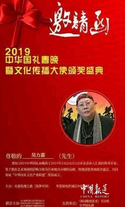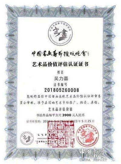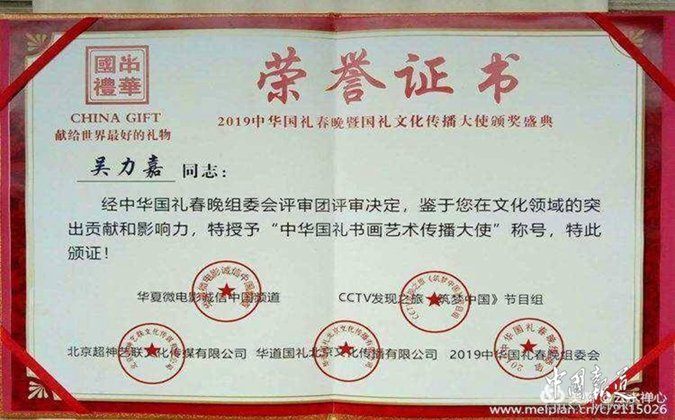 2019年1月,榮獲CCTⅤ中華國禮“書畫藝術(shù)傳播大使"榮譽稱號。2019年5.18CCTⅤ于廣州"商企匯"攜手同行,獲得“公益形象推廣大使"榮譽稱號。老吳2018參加中國北京首屆書畫春晚懸腕書法表演″家和萬事興"獲得十大書法家榮譽稱號!得到了多家媒體支持,網(wǎng)絡(luò)直播平臺和電視視頻支持,現(xiàn)已成為"網(wǎng)紅名人"。