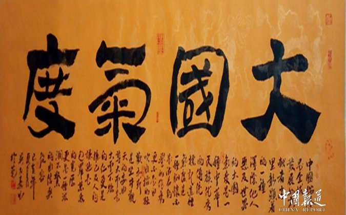 主題:四個字《大國氣度》,落款小字是:"中國始終是全球發(fā)展的貢獻者,這里彰顯著的是一種澤蔭他人,惠及世界的大國氣度,一種中華民族優(yōu)秀的傳統(tǒng)標記,這種氣度是一種胸懷,不是沽名釣譽的作秀,更不是自吹自擂的狂歡,亦或是坐井觀天的妄自尊大,而是大而不驕的仁愛,是推己及人的謙遜,是包羅萬象的寬厚,更是一種波瀾不驚的自信與從容。己亥年夏月吳力嘉書于莞(東莞的簡稱)。