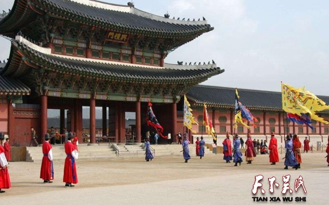 王宮得名于《景福宮(漢字:景福宮;諺文:???;英語(yǔ):Gyeongbokgung Palace),是朝鮮半島歷史上最后一個(gè)統(tǒng)一王朝——朝鮮王朝(李氏朝鮮)的正宮(法宮)。位于朝鮮王朝國(guó)都漢城(今韓國(guó)首爾),又因位于城北部,故又稱“北闕”,是首爾五大宮之首,朝鮮王朝前期的政治中心。景福宮始建于太祖洪武二十八年,歷經(jīng)多次破壞和重建。王宮面積與規(guī)制嚴(yán)格遵循與宗主國(guó)中國(guó)的宗藩關(guān)系,為親王規(guī)制的郡王府,所有建筑均以丹青之色來(lái)區(qū)別于中國(guó)皇宮的黃色。占地面積占地12.6萬(wàn)坪(57.75公頃),呈正方形,南面是正門光化門,東為建春門,西為迎秋門,北為神武門。1910年日本吞并朝鮮半島。1926年,日本在景福宮前建造朝鮮總督府。朝鮮日據(jù)時(shí)期,景福宮的大多建筑都相繼遭到拆除,僅保留正殿勤政殿、慶會(huì)樓等象征意義的建筑物。1995年韓國(guó)光復(fù)50周年之際,金泳三政府以恢復(fù)本國(guó)傳統(tǒng)文化,“清除日本統(tǒng)治時(shí)期象征”為由拆除日占時(shí)期建筑,原址開始大規(guī)模復(fù)建景福宮及其附屬建筑。2010年8月,韓國(guó)再次復(fù)建光化門,由原先所謂“去中國(guó)化”的諺文匾額恢復(fù)為傳統(tǒng)的漢字牌匾。