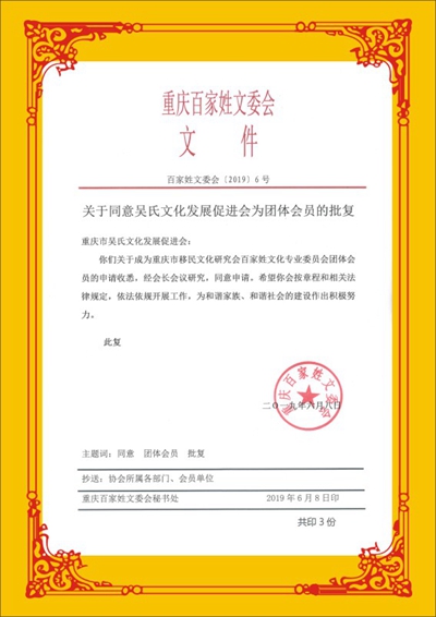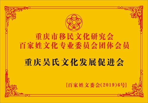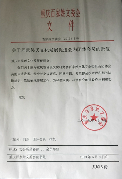 據(jù)介紹,全國(guó)各地省市均成立有吳氏宗親會(huì)組織,唯獨(dú)長(zhǎng)江上游地區(qū)直轄市重慶成為空白,據(jù)介紹,重慶吳氏文化發(fā)展促進(jìn)會(huì)是經(jīng)重慶市百家姓氏文化交流會(huì)批準(zhǔn)(2019)6號(hào)。據(jù)了解,目前重慶市百家姓氏文化交流會(huì)審批極為嚴(yán)格,每年僅有幾個(gè)姓氏名額獲審批。
