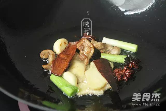 4.煸出油后倒入八角、桂皮、蒜、姜片、蔥白,炒出香味