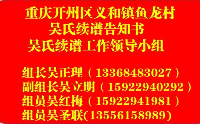 湖北來(lái)川(因張獻(xiàn)忠入川屠殺川人等原因?qū)е滤拇ㄈ丝隗E減)清朝初年朝廷下令湖廣填四川)祖籍開(kāi)縣中家溝(中安學(xué)校,現(xiàn)重慶市開(kāi)州區(qū)義和鎮(zhèn)魚(yú)龍村)吳氏宗親:凡是祖籍中家溝吳姓,字派為“起日高升、一舉成名、正立盛朝、顯耀家庭。。。。。。”的宗親,都是我們同祖同宗宗親,此次續(xù)譜系繼民國(guó)年間編撰譜書(shū)后第一次續(xù)譜,民國(guó)年間譜書(shū)記載到“名”字派和“正”字派,大房個(gè)別記載到“立”字派,至今已有“成、名、正、立、盛、朝、顯、耀”七派未入譜書(shū),續(xù)譜勢(shì)在必行,時(shí)不我待;此次續(xù)譜屬于家族事宜,自愿捐贈(zèng),做家族事宜的志愿者,續(xù)譜工作領(lǐng)導(dǎo)小組成員都是出錢(qián)出力的表率,不要報(bào)酬,自愿自費(fèi),宗親自當(dāng)效仿。