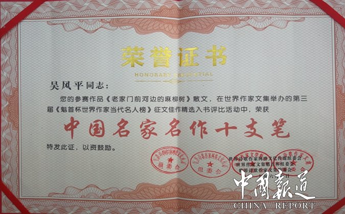 中國報道訊(吳蜀豐報道特約通訊員無言)近日,由世界作家文集舉辦的第三屆《魁首杯世界作家當代名人榜》征文佳作精選入書評比活動中,北京至德圣道中醫(yī)藥研究院院長,西安瑞泉中醫(yī)醫(yī)院院長,安康至德堂中醫(yī)館館長吳風平教授的參賽作品《老家門前河邊的麻柳樹》散文,經(jīng)過世界詩歌作家文化傳媒組委會、世界作家文集魁首杯組委會、世界詩歌作家文集編委會專家的嚴格評審,吳風平教授被授予“”稱號,據(jù)悉,這是該次評比活動中最高榮譽。