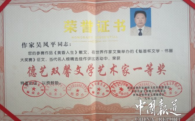 “德藝雙馨文學(xué)藝術(shù)家一等獎又悉,吳風平教授又在世界作家文集舉辦的《魁首杯文學(xué)書畫大獎賽》征文,當代名人榜精選佳作評比活動中,吳風平教授的《黃昏人生》散文,經(jīng)過專家認真評定,榮獲”。并頒發(fā)了獎杯與證書。