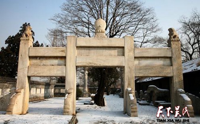 一重門,名曰招賢門。位于岐蔡路上坡后大約一公里處。稍加注意,就會發(fā)現(xiàn)大路兩旁,迎面凸兀出兩尊高大的門柱。若下去細看,就會看到上面裝飾著周代典型紋飾圖案,各有一個斗大的“周”字。再仔細一點,就會發(fā)現(xiàn)路西的門柱上還鑄有一組“文王禮賢”的浮雕,浮雕下正南方位,雕刻著一段文字,現(xiàn)不妨照錄如下: