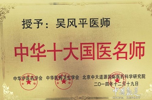 【個(gè)人榮譽(yù)】國(guó)家衛(wèi)生部授予“中華名醫(yī)”榮譽(yù)稱號(hào)。聯(lián)合國(guó)國(guó)際醫(yī)科大學(xué)、世界自然醫(yī)學(xué)基金會(huì)、世界自然醫(yī)學(xué)組織聯(lián)合授予“人類醫(yī)藥大師”;“世界千年名醫(yī)”“世界好醫(yī)師”“杰出貢獻(xiàn)獎(jiǎng)”。中國(guó)企業(yè)文化促進(jìn)會(huì)、中國(guó)社科院、清華大學(xué)、中國(guó)國(guó)際職業(yè)經(jīng)理人協(xié)會(huì)聯(lián)合授予“中國(guó)優(yōu)秀醫(yī)療科技工作者”。中國(guó)醫(yī)療保健國(guó)際交流促進(jìn)會(huì)授予“杰出貢獻(xiàn)獎(jiǎng)”。特邀出席中國(guó)名醫(yī)第四屆論壇大會(huì),受到中央領(lǐng)導(dǎo)和國(guó)家衛(wèi)生部領(lǐng)導(dǎo)的表?yè)P(yáng)和接見;吳風(fēng)平創(chuàng)辦并領(lǐng)導(dǎo)的“安康傳統(tǒng)醫(yī)學(xué)研究所”因在科研上取得重大成果,而被評(píng)審授予“三星級(jí)單位”及“中國(guó)優(yōu)秀職業(yè)經(jīng)理人”稱號(hào)。中國(guó)民營(yíng)經(jīng)濟(jì)研究會(huì)、中國(guó)最具發(fā)展?jié)摿ζ髽I(yè)高層論壇組織委員會(huì)授予“中國(guó)最具發(fā)展?jié)摿ζ髽I(yè)”和“中國(guó)最具發(fā)展?jié)摿ζ髽I(yè)領(lǐng)軍人物”稱號(hào)。中華中醫(yī)藥學(xué)會(huì)授予“全國(guó)基層優(yōu)秀中醫(yī)”光榮稱號(hào)。吳風(fēng)平先生的個(gè)人事跡被錄入《世界名醫(yī)大典》、《中國(guó)中醫(yī)名人榜》、《中國(guó)優(yōu)秀特色專科名醫(yī)薈萃》、《中華各界建設(shè)先鋒人物》《世紀(jì)風(fēng)采人物》等大型權(quán)威辭書。