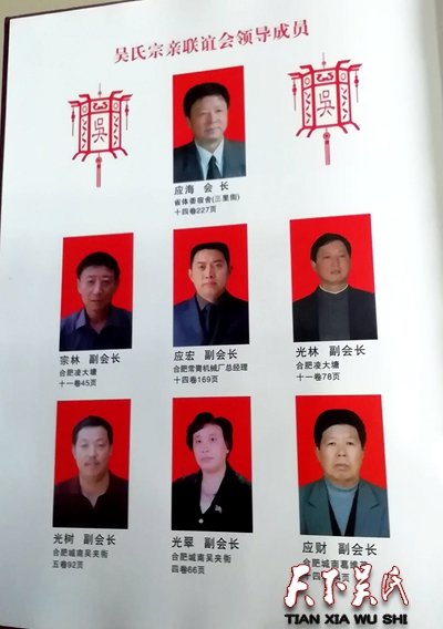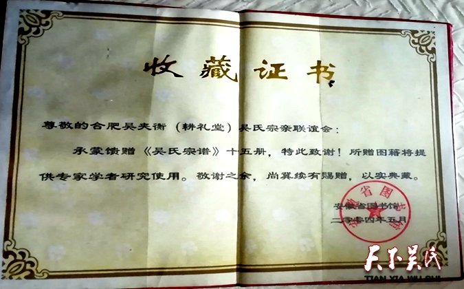 據(jù)吳應(yīng)海宗長介紹,吳夾街耕禮堂吳氏宗親聯(lián)誼會自2003年以來至今,前后4次修吳氏宗譜,全套15冊,該族譜內(nèi)容十分豐富具有很高的收藏價(jià)值,該族譜分別被上海圖書館、安徽省圖書館收藏。據(jù)吳大艮介紹,合肥吳氏(耕禮堂)四次修普的發(fā)起人,由前任副會長吳宗林發(fā)起的,因我父親吳宗林,是在2001年的時(shí)候,在我家附近做工程,有大量的時(shí)候,他就想起了和已過世的老長輩吳應(yīng)馥談起了我們(耕禮堂)四次修家譜一事,當(dāng)時(shí)吳應(yīng)馥生了大病,身體不是太好,還但心修不起來,修家譜是一項(xiàng)龐大的工程,要四處跑聯(lián)絡(luò),如果沒有堅(jiān)強(qiáng)意志力和耐力這家譜是修不成的,所以呢我父親吳宗林就給了我們老宗長吳應(yīng)馥的堅(jiān)強(qiáng)的信心和決心,才打動(dòng)了老宗長吳應(yīng)馥的信心,就這樣才有了,我們合肥吳氏(耕禮堂)四次修家譜的開始。