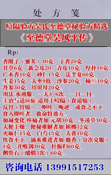 主治與適應(yīng)癥:適用于噎隔(食道癌),反胃(胃癌),嘔吐,呃逆,或食之不下,食入即吐者,救命特效方。