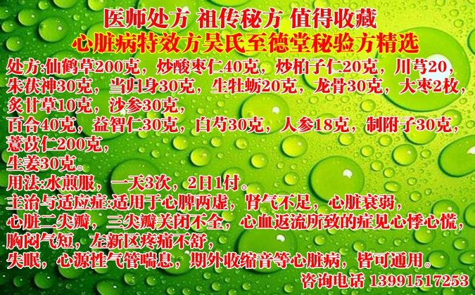 主治與適應癥:適用于心脾兩虛,腎氣不足,心臟衰弱,心臟二尖瓣,三尖瓣關閉不全,心血返流所致的癥見心悸心慌,胸悶氣短,左新區(qū)疼痛不舒,失眠,心源性氣管喘息,期外收縮音等心臟病,皆可通用。