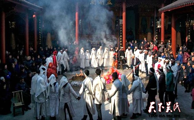 老人逝后到安埋,孝子要輪流不離人的在停床跟前守靈,陪送老人最后一程,并防貓狗雞等沖進來造成“驚尸”。對前來吊唁者,要點香燒錢兩,給吊唁者還禮。從老人逝后到安埋,要香火不斷,即蠟燭清油燈不滅,香火續(xù)上。在停柩待葬期間,有家屬“辟踴哭泣”的禮儀,《禮記·問喪》中有非常詳細的規(guī)定:“三日而斂。在床曰尸,在棺曰柩,動尸舉柩,哭踴無數(shù),惻怛之心,痛疾之意,悲哀志懣氣盛,故袒而踴之,所以動體安心下氣也;婦人不宜袒,古發(fā)胸擊心爵踴,殷田田如壞墻然,悲痛疾之至也,故曰辟踴哭泣,哀以送之,送形而往,迎精而反也。”大意是說,三日大殮時,當(dāng)尸體被抬進棺材時,子女們就開始放聲大哭,其中男性應(yīng)該坦露上身,一邊哭一邊頓足,而女子則捶胸頓足放聲大哭。