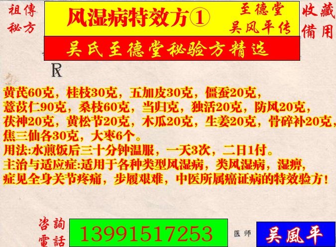 主治與適應(yīng)癥:適用于各種類型風(fēng)濕病,類風(fēng)濕病,濕痹。癥見(jiàn)全身關(guān)節(jié)疼痛,步履艱難,中醫(yī)所屬癌證病的特效驗(yàn)方!