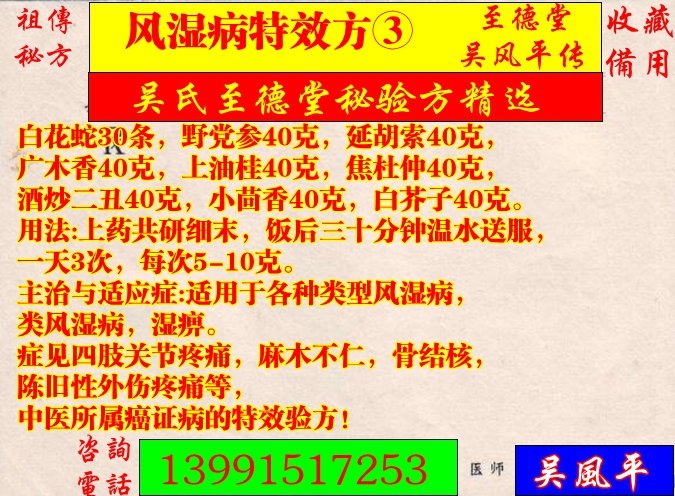 主治與適應(yīng)癥:適用于各種類(lèi)型風(fēng)濕病,類(lèi)風(fēng)濕病,濕痹。癥見(jiàn)四肢關(guān)節(jié)疼痛,麻木不仁,骨結(jié)核,陳舊性外傷疼痛等,中醫(yī)所屬癌證病的特效驗(yàn)方!
