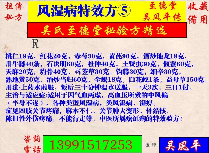 主治與適應(yīng)癥:適用于因氣血兩虛,高血壓所致的中風(fēng)偏癱(半身不遂),各種類型風(fēng)濕病,類風(fēng)濕病,濕痹。癥見四肢關(guān)節(jié)疼痛,麻木不仁,關(guān)節(jié)腫大變形,骨結(jié)核,陳舊性外傷疼痛,不能行走等,中醫(yī)所屬癌證病的特效驗(yàn)方!