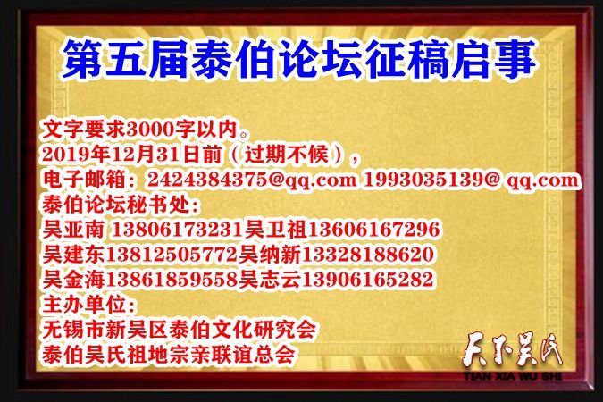 吳文化是中華優(yōu)秀傳統(tǒng)文化的重要組成部分,其核心內容是泰伯精神。而弘揚泰伯精神,對于延續(xù)中華文脈,全面提升人民群眾文化素養(yǎng),增加中華民族文化自信,增強國家文化的軟實力,維護國家文化安全,推進國家治理體系和治理能力的科學化、現(xiàn)代化,提升我吳氏的影響力等,都具有重要的現(xiàn)實意義和深遠的歷史意義。自2014年10月12日在祖地無錫泰伯廟召開首屆《泰伯論壇》以來,已舉辦四屆,現(xiàn)經(jīng)泰伯論壇理事會、泰伯論壇秘書處及全國各地吳氏宗親代表商量,第五屆泰伯論壇將于2020年4月11日在無錫梅村召開。