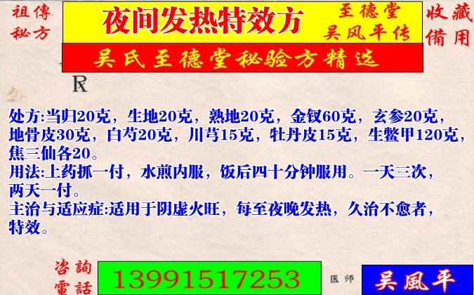 主治與適應癥:適用于陰虛火旺,每至夜晚發(fā)熱,久治不愈者,特效。